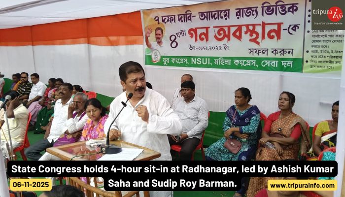 State Congress holds 4-hour sit-in at Radhanagar, led by Ashish Kumar Saha and Sudip Roy Barman....