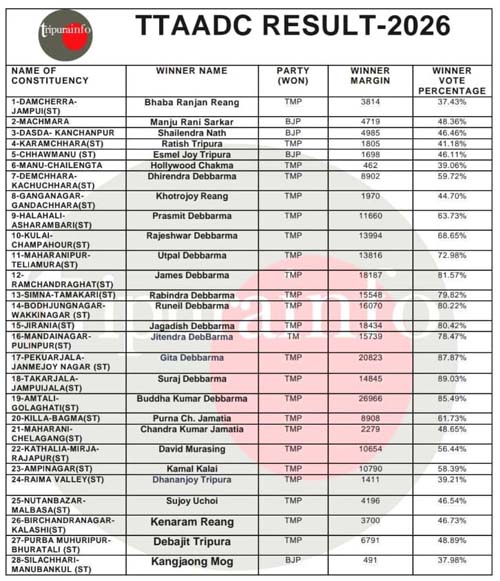 ত্রিপুরা ট্রাইবাল এরিয়া অটোনোমাস ডিস্ট্রিক্ট কাউন্সিল (টিটিএএডিসি)-এর ২০২৬ সালের নির্বাচনে তিপ্রামথা দল ২৮ আসনের মধ্যে ২৪ আসনে জয় নিশ্চিত করল। তিপ্রামথার এই বিপুল সংখ্যক আসনে জয় শুধু একটি আঞ্চলিক রাজনৈতিক দলের নির্বাচনী সাফল্য নয়, বরং এটি ত্রিপুরার রাজনীতিতে একটি বড় পরিবর্তনের ইঙ্গিত বহন করছে। এই ফলাফল বিশেষ করে ২০২৮ সালের বিধানসভা নির্বাচনের নিরিখে অত্যন্ত তাৎপর্যপূর্ণ। অপরদিকে বিজেপি-র মাত্র ৪ আসনে সীমাবদ্ধ হয়ে পড়া স্পষ্টভাবে দেখিয়ে দিয়েছে যে পাহাড়ে তাদের জনভিত্তি মারাত্মক ভাবে ক্ষতিগ্রস্ত হয়েছে।