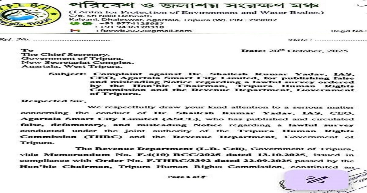 A serious complaint has been filed against Dr. Shailesh Kumar Yadav, IAS, Chief Executive Officer of Agartala Smart City Limited (ASCL), accusing him of publishing and circulating false, misleading, and defamatory information regarding a lawful survey jointly ordered by the Tripura Human Rights Commission (THRC) and the Revenue Department, Government of Tripura.