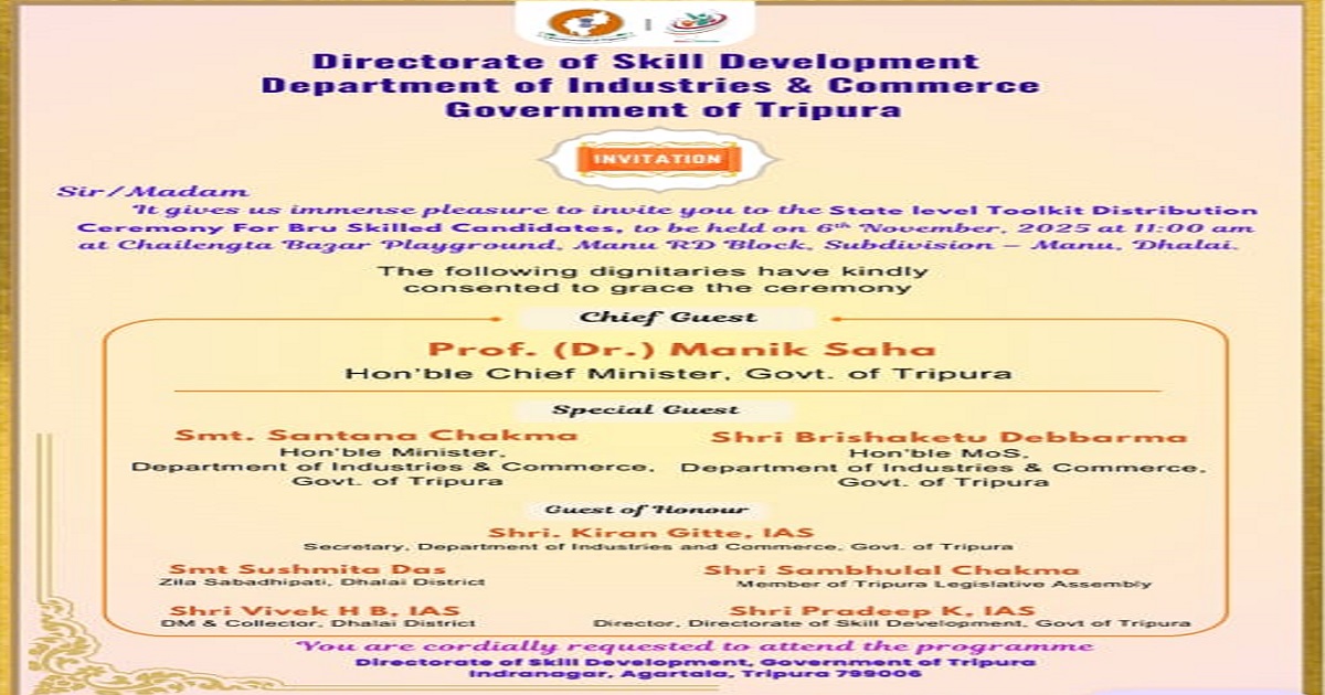 The Directorate of Skill Development, Government of Tripura, has extended a cordial invitation to all stakeholders and beneficiaries to attend the ceremony and witness this milestone event that reinforces the government’s commitment to inclusive growth and skill-based empowerment in the state.
