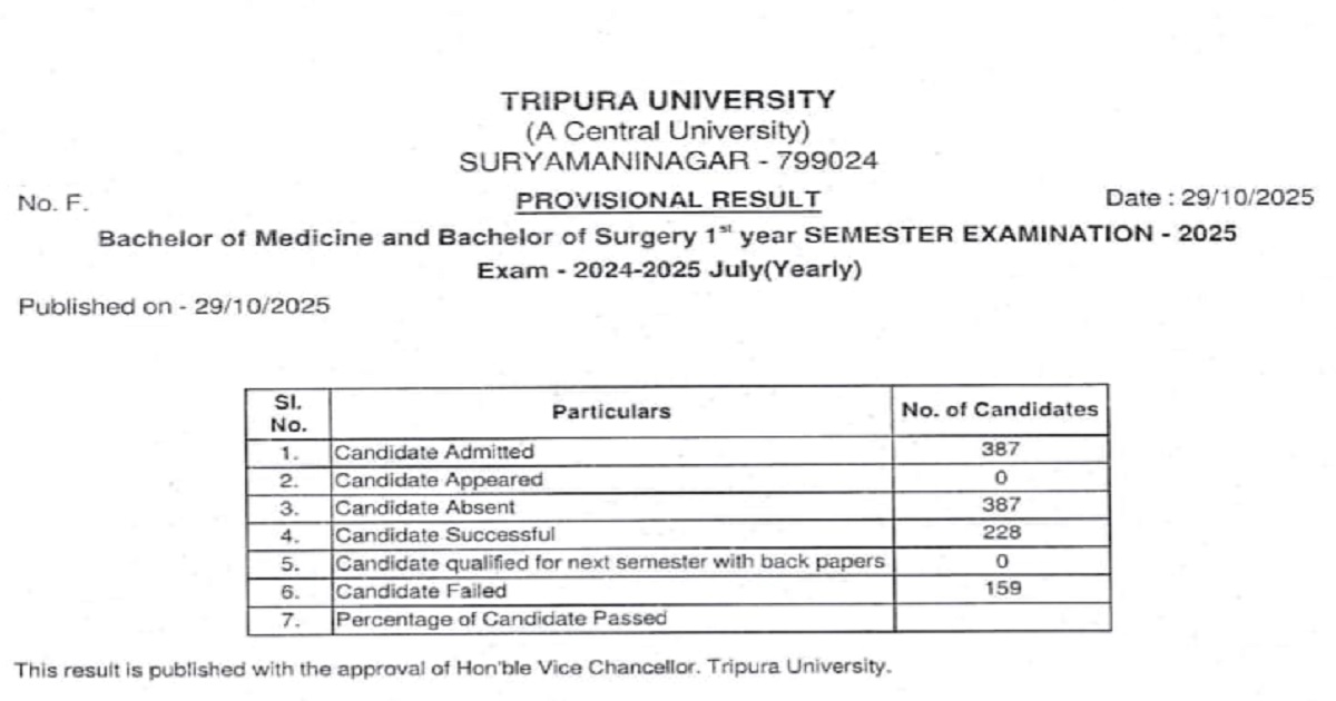 Across all three medical colleges in Tripura, 387 students appeared in the first-year MBBS examination out of 400 eligible students, and only 228 passed, leaving 159 students to reappear in supplementary exams.
