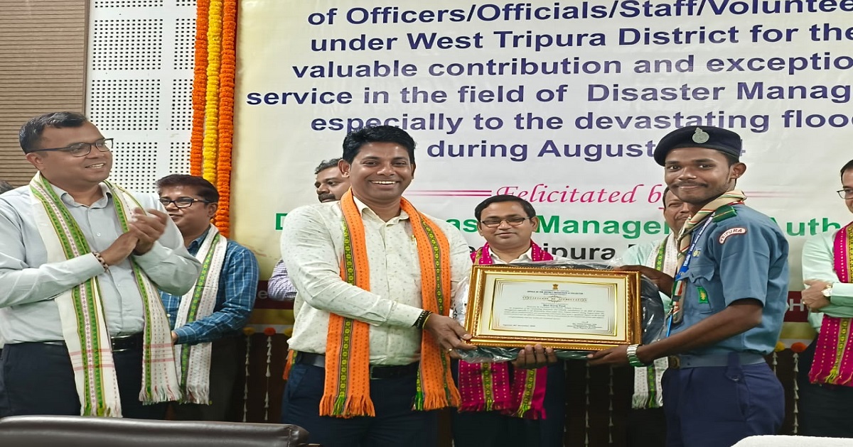 The District Disaster Management Authority (DDMA), West Tripura District, organized a felicitation programme to honour and recognize the dedicated volunteers, officers, officials, and staff who rendered outstanding service in the field of disaster management, particularly during the devastating floods of August 2024.