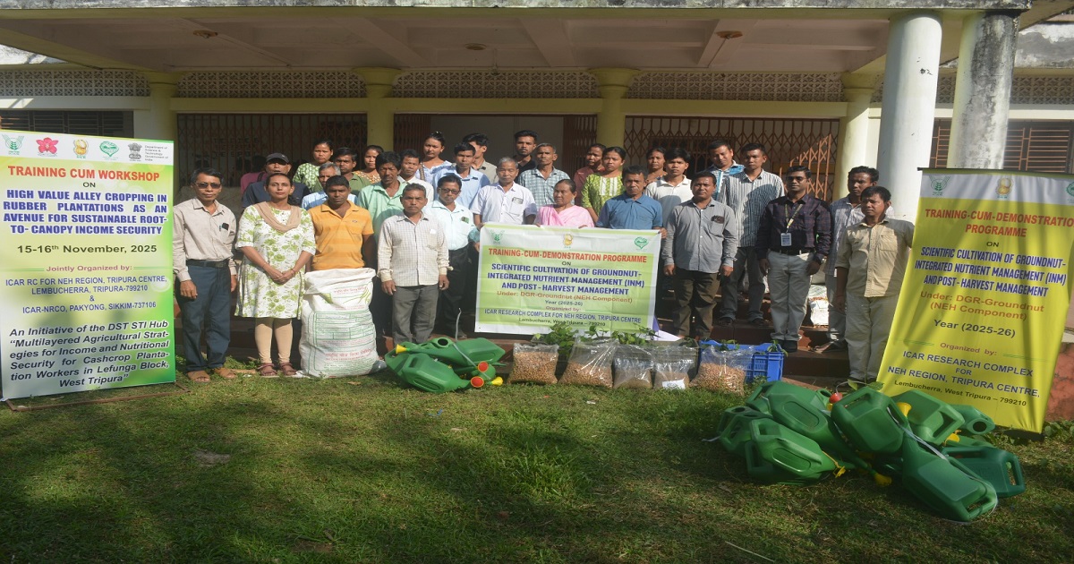 The ICAR Research Complex for North Eastern Hill Region, Tripura Centre has successfully completed a seven-day intensive training programme titled, 'Agri-Aqua Interventions for Productivity Enhancement from Under-Cropped Land', held from 10 November 2025 under the DST-supported STI Hub operational at the Centre. The programme was conducted as part of the DST project Multilayered Agriculture Strategies for Income and Nutritional Security for Cash Crop Plantation Workers in Lefunga Block, West Tripura District.