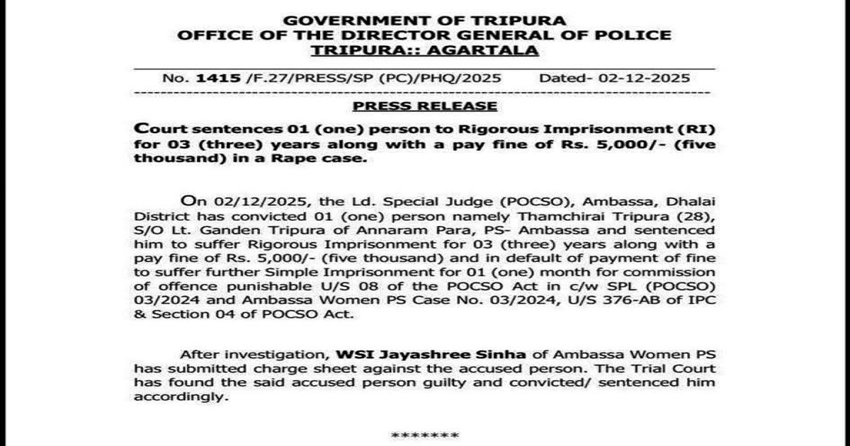 According to a press release issued by the Tripura Police, the court on 02 December 2025 convicted Thamchirai Tripura (28) of Annaram Para under Ambassa Police Station for an offence under Section 08 of the POCSO Act, along with Section 376-AB of the IPC. The court sentenced him to three years RI and imposed a Rs. 5,000 fine, with an additional one month of simple imprisonment in case the fine is not paid.