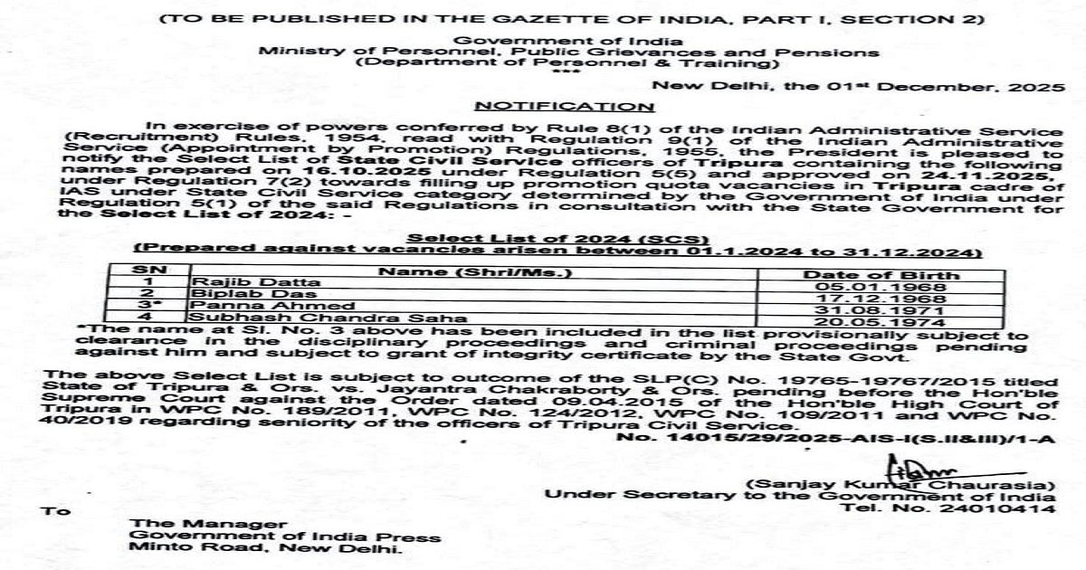 A major controversy has erupted in Tripura after the Government of India published the Select List of 2024 (State Civil Service) for promotion to the Indian Administrative Service (IAS), where an officer with pending disciplinary and criminal proceedings and previously convicted has been provisionally included for promotion.