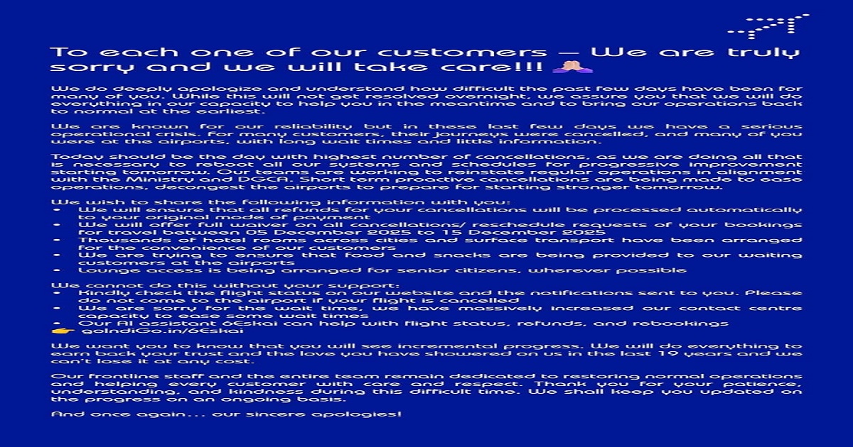 Amid rising public fury, IndiGo issued a formal apology, acknowledging the hardship caused to passengers and outlining several measures: