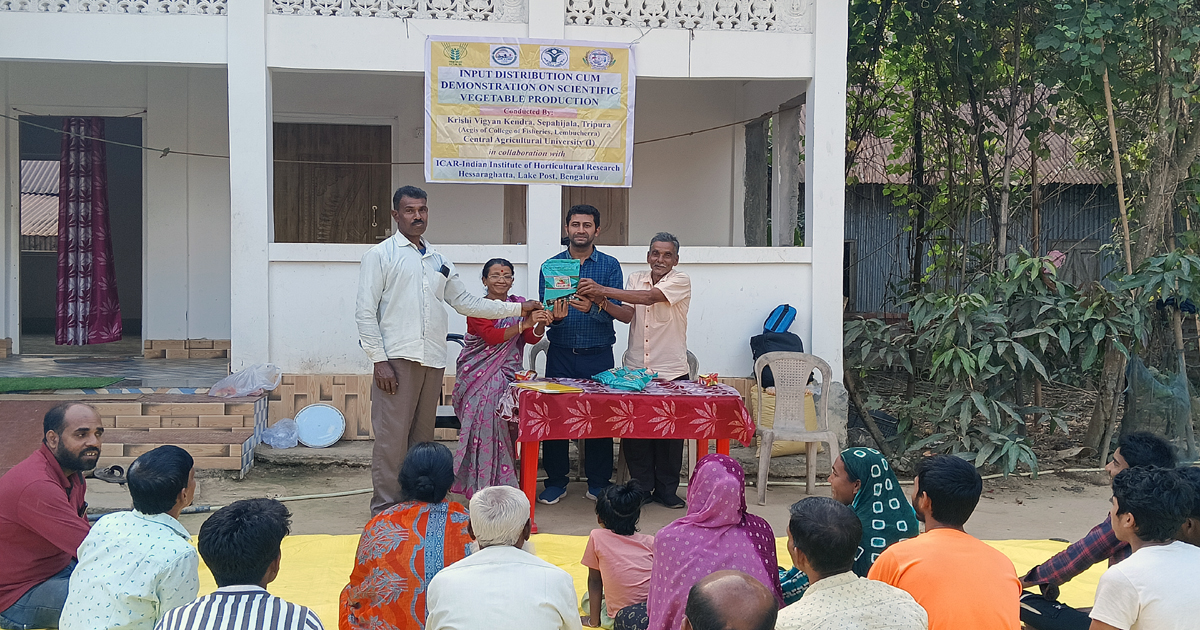 Krishi Vigyan Kendra, Sepahijala, CAU (I), Tripura in collaboration with ICAR-Indian Institute of Horticultural Research (ICAR-IIHR), Hessaraghatta Lake Post, Bengaluru organized “Demonstration on Scientific Vegetable Production” at North Charilam GP, Charilam R.D. block, Sepahijala Tripura on 22nd December. The programme was conducted under the guidance of Dr. Anupam Mishra, Hon’ble Vice-Chancellor, CAU, Imphal. This programme was held with the objective to increase the area under scientific vegetable cultivation of IIHR varieties. The programme was organized under the guidance of Dr Tusar Kanti Behera, Director, ICAR-IIHR, Bengaluru; Dr. A. K. Mohanty, Director, ICAR-ATARI, Zone-VII, Umiam, Meghalaya; Prof. Ph. Ranjit Sharma, Director of Extension Education, CAU (I), Manipur; Prof. Arun Bhai Patel, Dean, College of Fisheries, CAU (I), Lembucherra, Tripura; Dr T. Sakthivel, Principal Scientist (Horticulture), Division of Fruit Crops, ICAR-IIHR, Bengaluru and Dr Shatabhisa Sarkar, Senior Scientist & Head, KVK, Sepahijala.