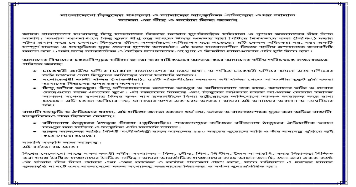Social Media Statement Rajib Bhattacharjee further highlighted the issue through his social media posts, where he reiterated that attacks on temples, religious leaders, and Bengali cultural icons are direct attacks on pluralism, coexistence, and shared history of the Bengal region. He called upon people of conscience, both within India and abroad, to raise their voices against injustice.