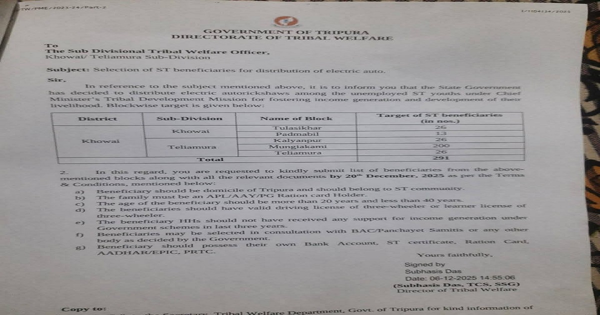The Directorate of Tribal Welfare had earlier instructed Sub-Divisional Tribal Welfare Officers to submit beneficiary lists by December 20, along with requisite documents such as ST certificates, driving licenses, ration cards, and bank details, as per prescribed eligibility norms.
