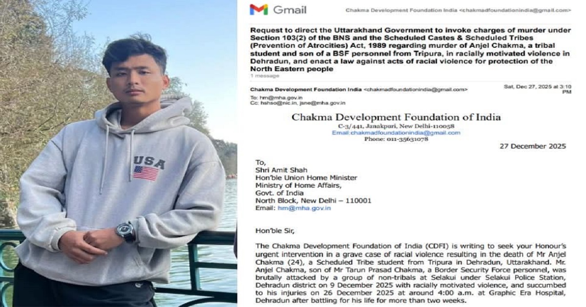 The Chakma Development Foundation of India (CDFI) has urged Union Home Minister Amit Shah to ensure a fast-track trial in a designated court for the racially motivated murder of Anjel Chakma, a Scheduled Tribe student from Tripura, and to enact a comprehensive anti-racial violence law to curb growing attacks against people from the North East.