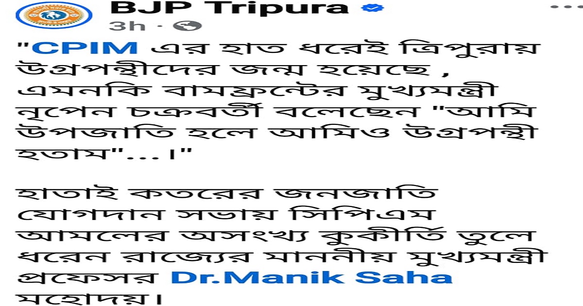 The official Facebook page of the Bharatiya Janata Party (BJP) on Monday quoted Tripura Chief Minister Dr. Manik Saha making sharp allegations against the Left parties, claiming that extremism in Tripura took root during the CPI(M) regime.