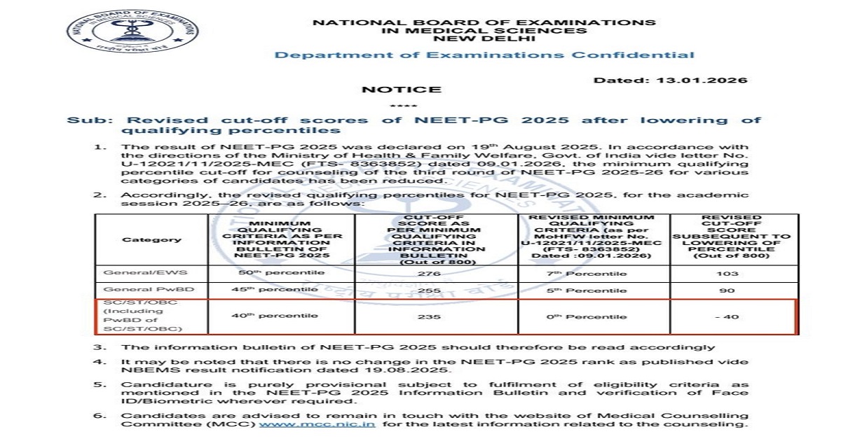 As per the notice dated January 13, 2026, the revised qualifying criteria apply to counselling for the third round of NEET-PG 2025–26. The most startling change is for the SC, ST and OBC category, where the qualifying percentile has been reduced from 40th percentile to zero percentile. In terms of marks, this translates to a revised cut-off score of minus 40 out of 800, a figure that has shocked even senior members of the medical fraternity.