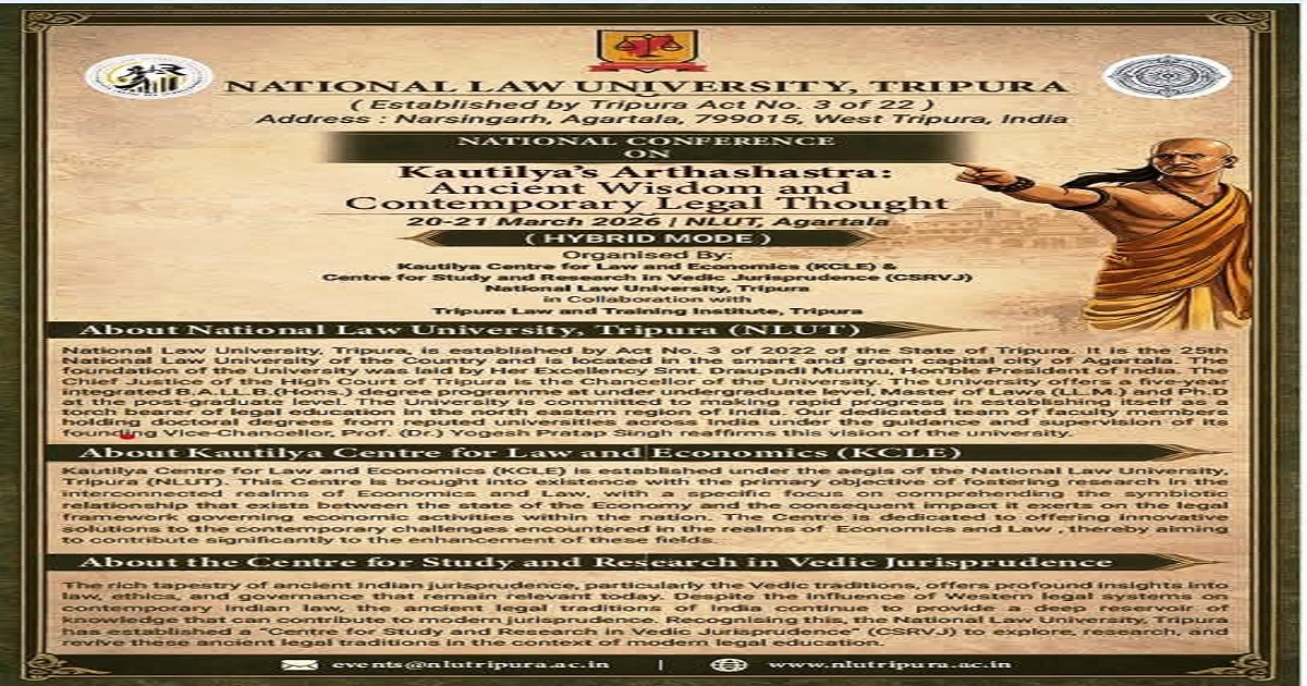 Agartala will become a hub of scholarly dialogue on law, governance, and economics as National Law University, Tripura (NLUT) is set to organise a two-day National Conference on 'Kautilya’s Arthashastra: Ancient Wisdom and Contemporary Legal Thought' on 20–21 March 2026. The conference will be held at the NLUT campus in Agartala in hybrid mode, allowing participation both offline and online.