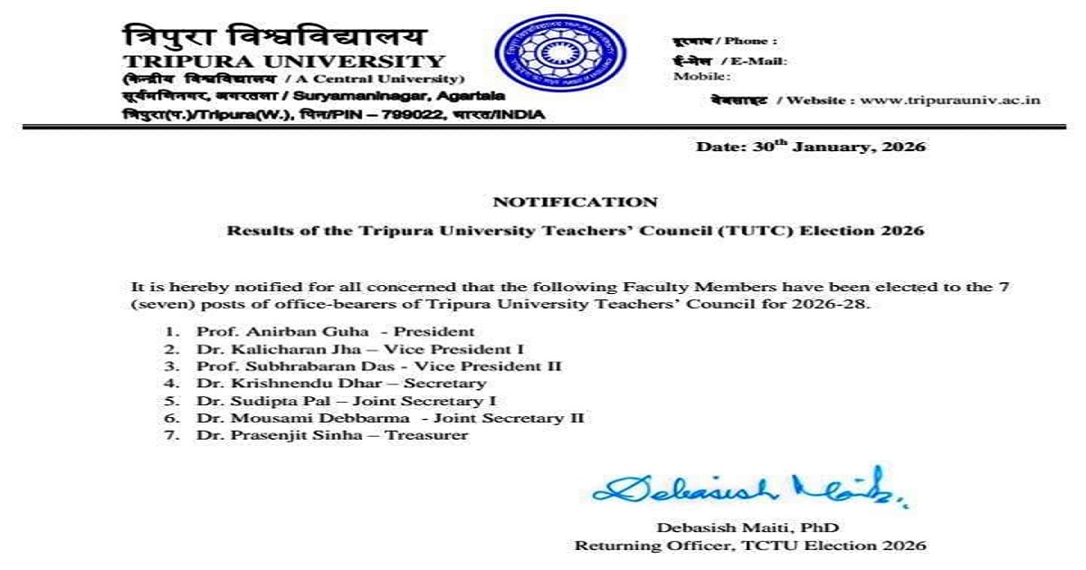 Tripura University has taken an important step towards strengthening academic governance and institutional development with the successful conclusion of the Teachers’ Council (TUTC) Election 2026. The newly elected body is expected to play a key role in promoting faculty participation, enhancing transparency in decision-making, and supporting the overall progress of the university for the 2026–28 term.
