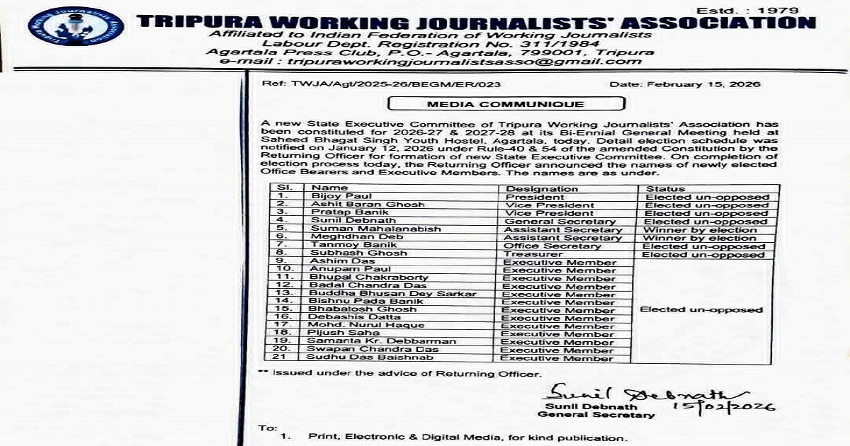 The Tripura Working Journalists Association (TWJA), one of the prominent representative bodies of media professionals in the state, has officially constituted its new State Executive Committee for the 2026–27 and 2027–28 terms. The announcement was made following the Bi-ennial General Meeting held at Shaheed Bhagat Singh Youth Hostel in Agartala on Saturday.
