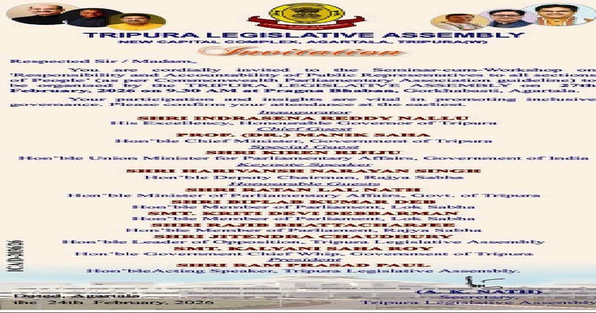 The Tripura Legislative Assembly will organize a significant Seminar cum Workshop on the theme “Responsibility and Accountability of Public Representatives to all Sections of People” on February 27, 2026, at 9:30 AM at Pragna Bhavan, Gurkhabasti, Agartala.