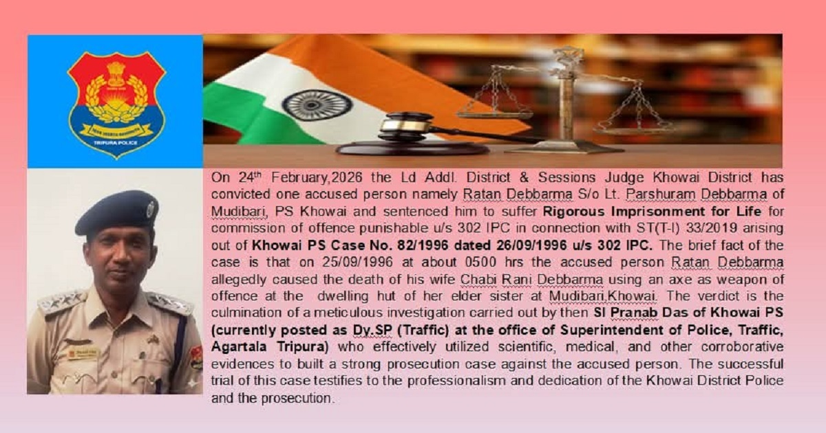 In a significant legal development, a murder case registered nearly three decades ago at Khowai Police Station has finally reached its conclusion. The Court of the Additional District & Sessions Judge, Khowai District, on February 24, 2026, convicted the accused under Section 302 of the Indian Penal Code (IPC) and sentenced him to life imprisonment.