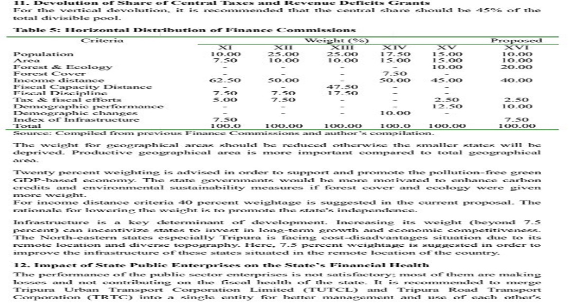 However, the study raises concerns over the 10 percent weight assigned to geographical area. Experts argue that this criterion may disadvantage smaller states such as Tripura and recommend shifting focus toward productive geographical area to ensure a more balanced and fair allocation mechanism. The income distance criterion, which carries a 40 percent weight, has been deemed appropriate but requires careful calibration to gradually encourage fiscal self-reliance among states.Infrastructure development emerges as a major concern in the report. With only 7.5 percent weight currently assigned to the infrastructure index, the study suggests increasing this share, emphasizing that states like Tripura face higher infrastructure costs due to difficult terrain and connectivity limitations. Strengthening infrastructure is viewed as critical for enhancing economic competitiveness and improving regional integration.